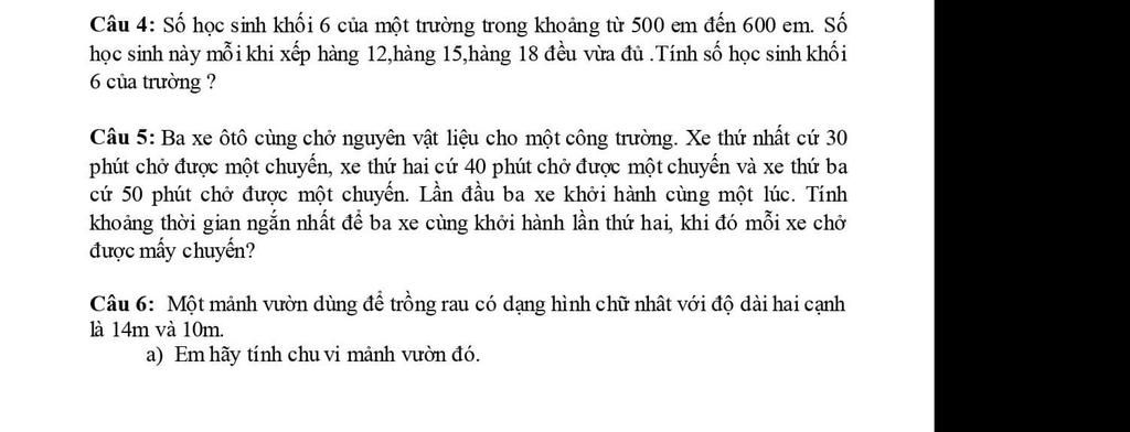 Câu 4: Số học sinh khối 6 của một trường trong khoảng từ 500 em đến 600 em. Số