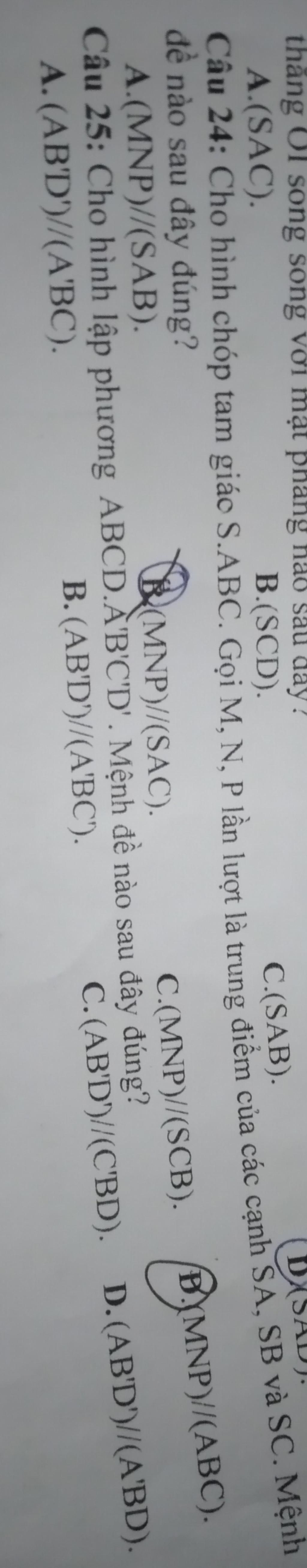 Câu 24: Cho hình chóp tam giác S.ABC. Gọi M, N, P lần lượt là trung điểm của các cạnh SA, SB và SC. Mệnh