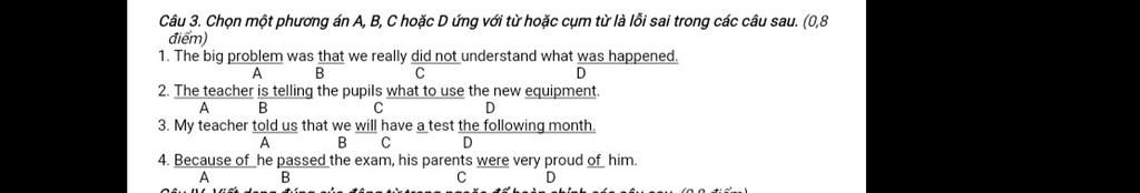 Câu 3. Chọn một phương án A, B, C hoặc D ứng với từ hoặc cụm từ là lỗi sai trong các câu sau. (0,8