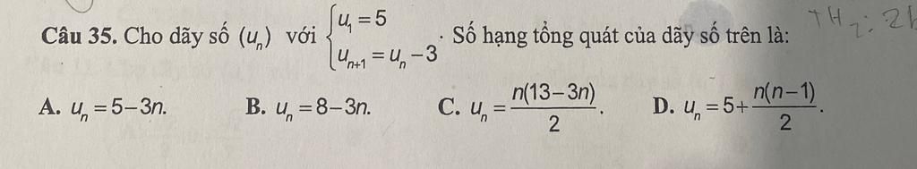 `->u_n=5+\underbrace{(-3)+(-3)+...+(-3)}_{\text{n-1 số hạng}}=5-3(n-1)=8-3n`