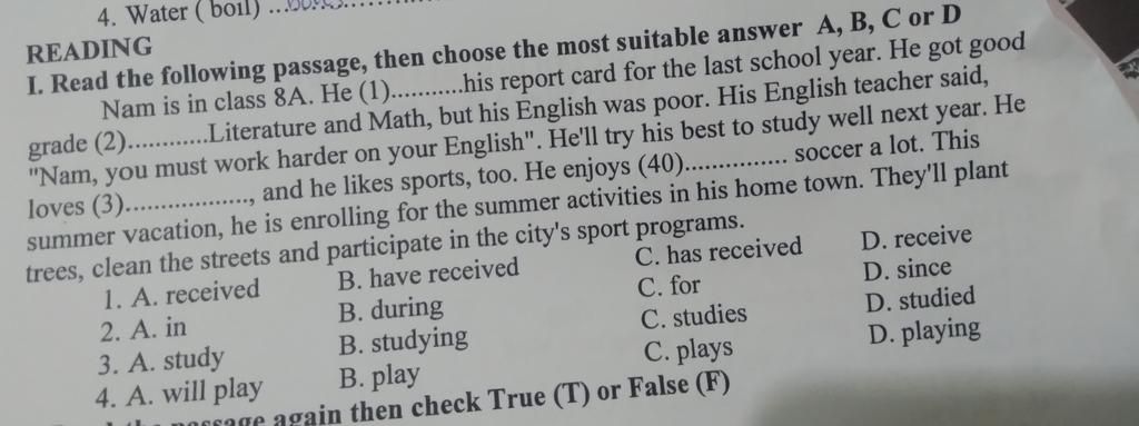 Nam is in class 8A. He (1)...........his report card for the last school year. He got good
