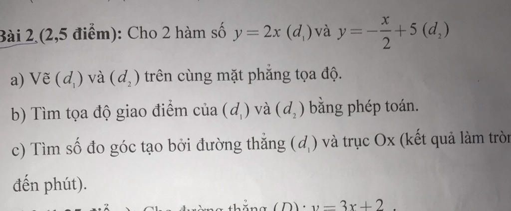 c) Tìm số đo góc tạo bởi đường thẳng ( d ) và trục Ox (kết quả làm tròi