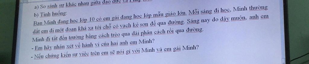 $-$ Nếu chứng kiến sự việc trên em sẽ nói Minh và em gái Minh cần phải tuân thủ pháp luật , cần phải rút kinh nghiệm về việc dạy muộn và đến trường mà không làm trái pháp luật , xin thầy cô vào lớp học một cách đoàng hoàng