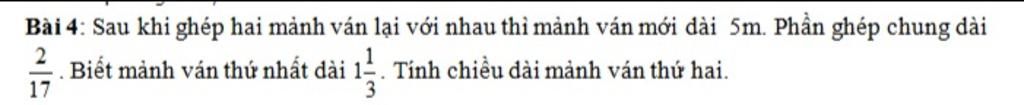 Mảnh vải thứ nhất dài số mét là: `4/3 - 2/17 = 62/51` m