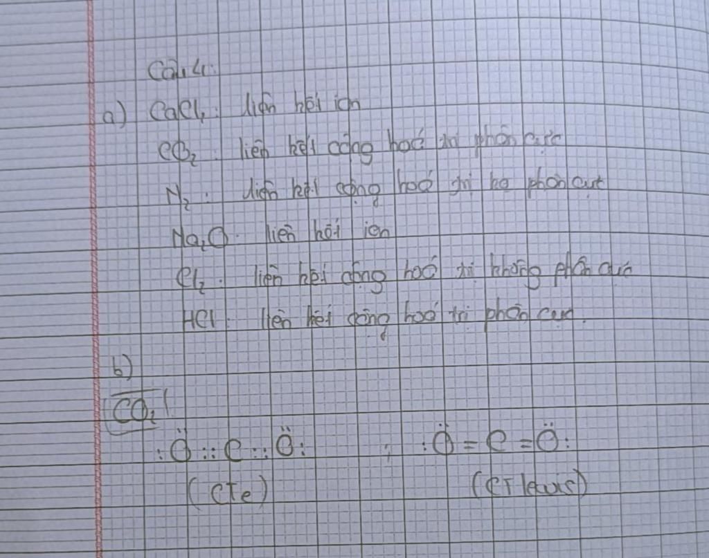 Câu 4: Cho các phân tử sau: CaCl2, CO2, N2, Na2O, Cl2, HCl