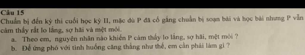 a, Theo em, do P cảm thấy có quá nhiều áp lực về số điểm, về những sự kì vọng của bố mẹ, bạn bè, thầy cô và thành tích đã khiến P cảm thấy lo lắng, sợ hãi và mệt mỏi.( tâm lí học sinh )