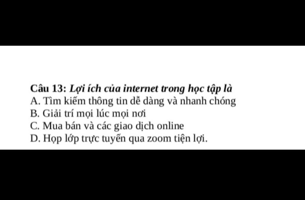 Câu 13.Lợi ích của internet trong học tập là tìm kiếm thông tin dễ dàng và nhanh chóng