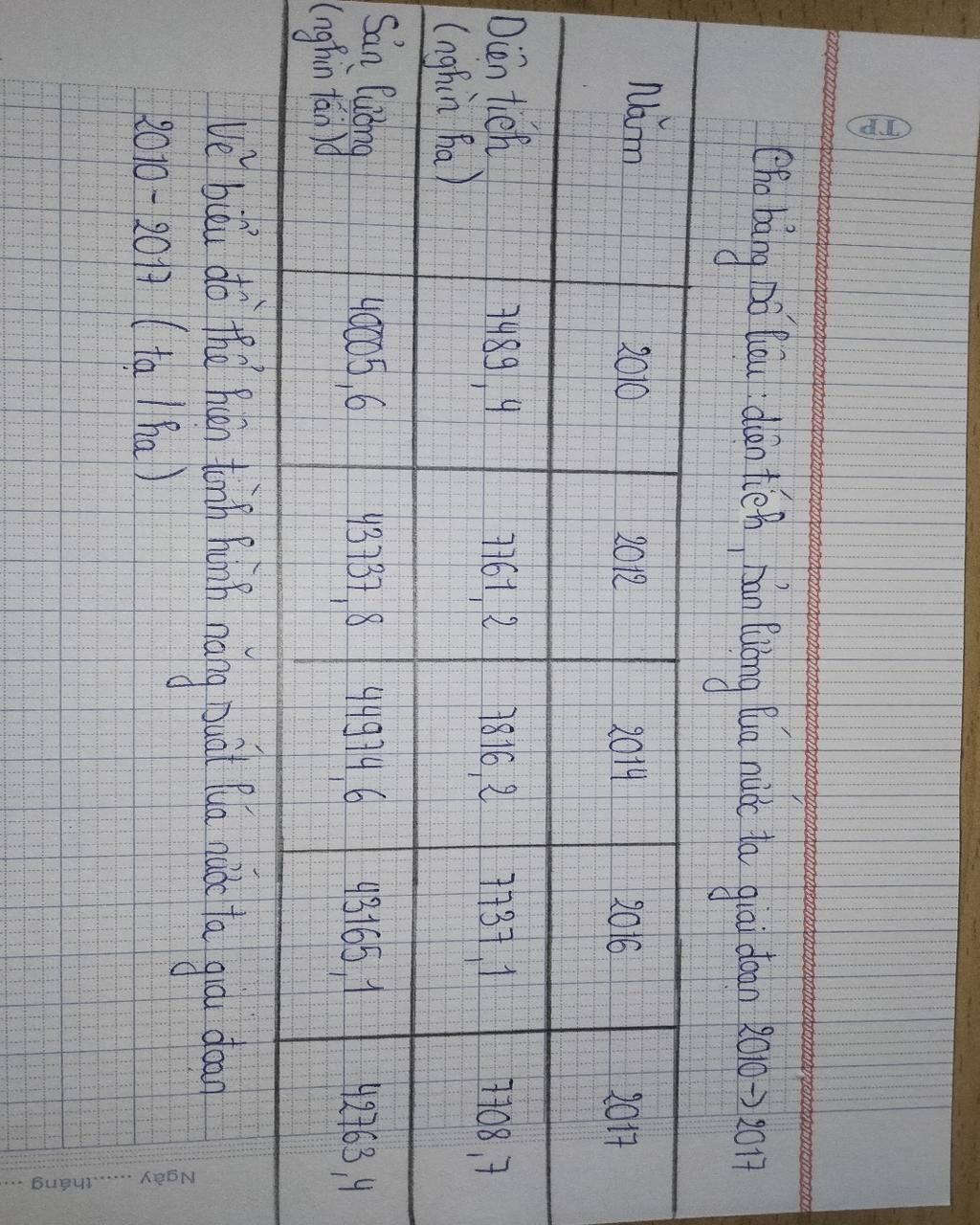 Cho bảng số liệu diện tích sản lượng lúa nước ta giai đoạn 2010 - 2017. Vẽ biểu đồ thể hiện tình hình năng suất lúa giai đoạn 2010 - 2017 (tạ/ha)