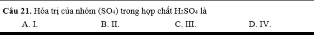 Trong phân tử sulfuric acid (H2SO4), nhóm (SO4) liên kết với 2 nguyên tử hydrogen nên có hóa trị II.