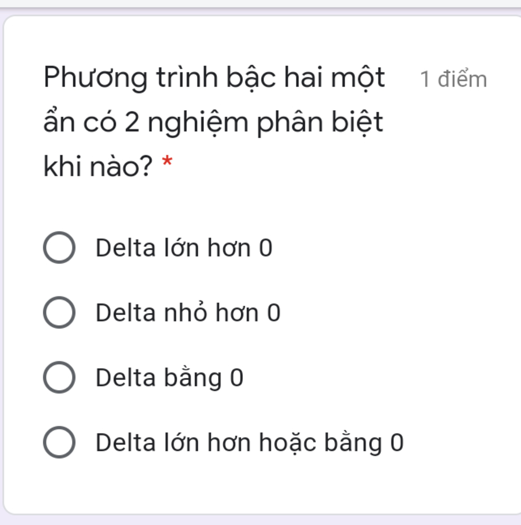 Phương trình bậc hai một ẩn có 2 nghiệm phân biệt khi $\Delta>0$