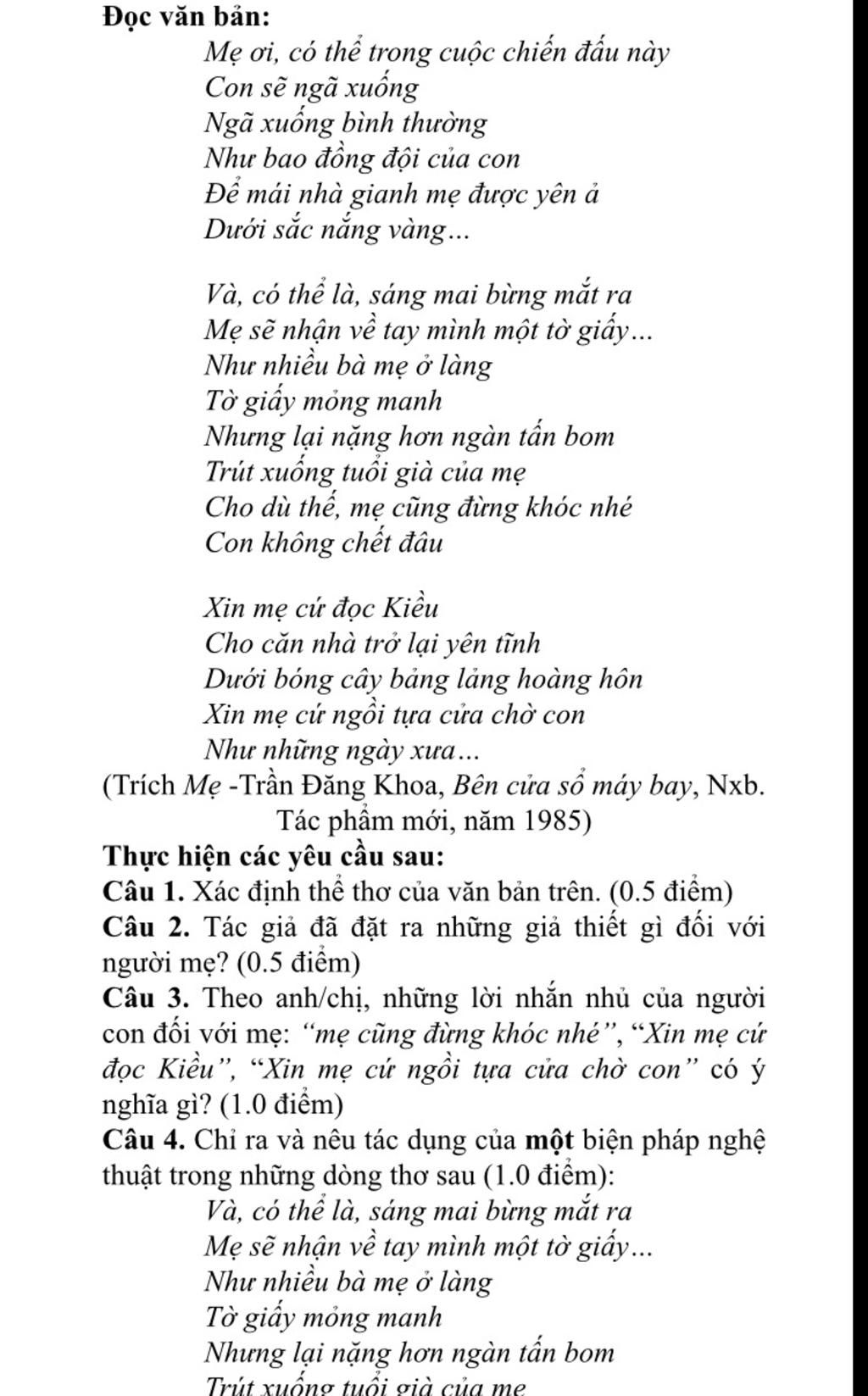 Câu 3. Những lời nhắn nhủ của người con đối với mẹ: mẹ cũng đừng khóc nhé, Xin mẹ cứ đọc Kiều, Xin mẹ cứ ngồi tựa cửa chờ con có ý nghĩa: động viên mẹ hãy luôn lạc quan, vui vẻ, đừng buồn và hãy có niềm tin vào một ngày con sẽ quay lại.