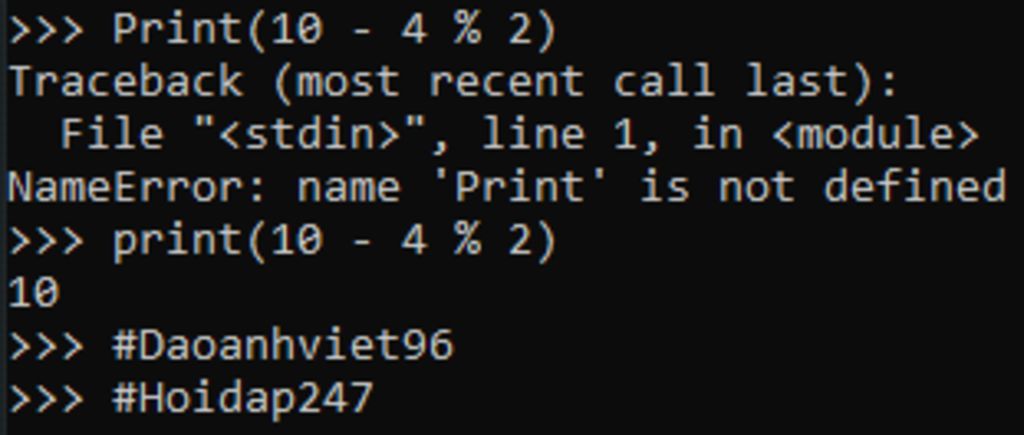 `***` Nếu câu lệnh là: Print(10 - 4 % 2)