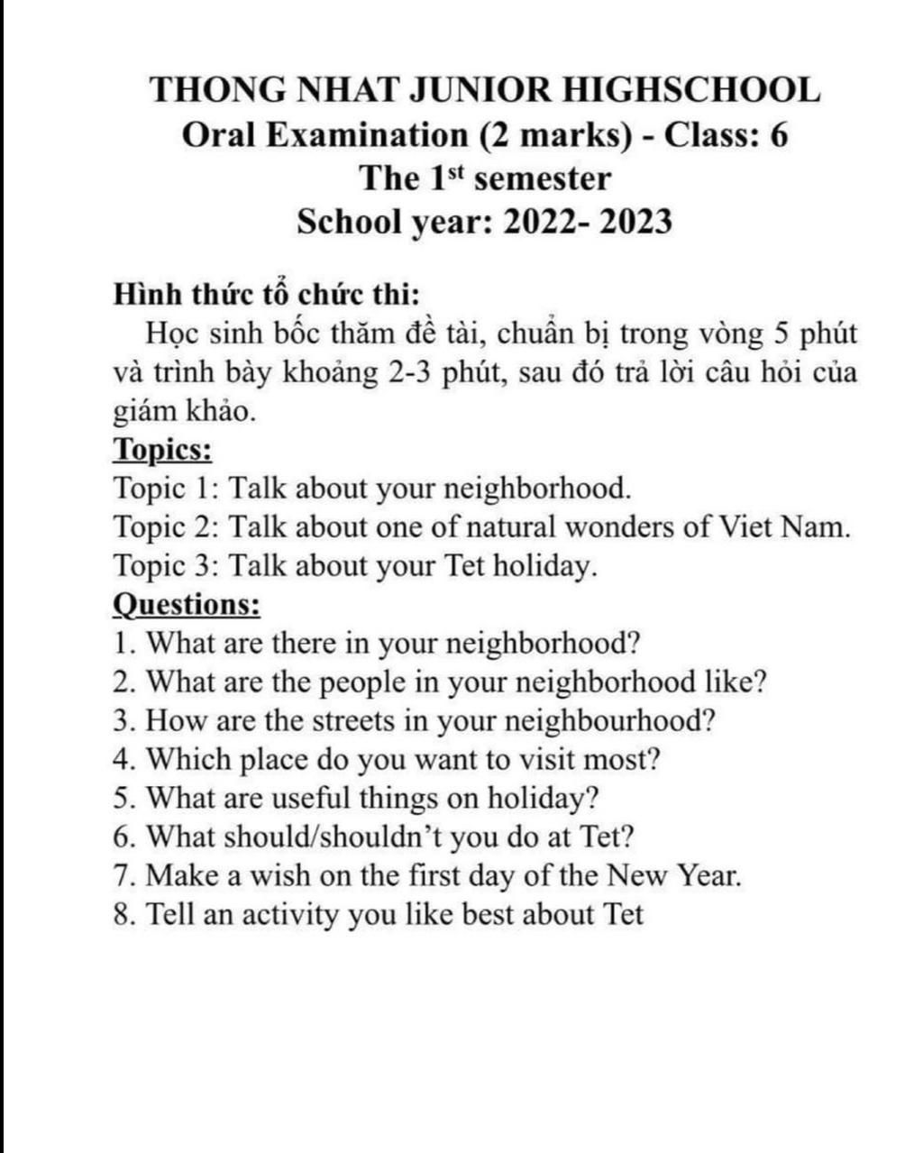 Topic 3 : Tet is the biggest traditional festival in Vietnam and many Asian countries. This is an opportunity for people to enjoy a happy and relaxing period of time with their family and friends. Before Tet, Vietnamese people always decorate their houses, buy some cherry blossom branches or Kumquat tree, make Chung cake. On New Years Eve, most families gather together to have a warm dinner and a traditional ritual in order to commemorate our ancestors. On the first day of New Year, youngsters will give their best greetings to oldsters and receive lucky money. In the rest time of Tet, people can go to pagodas to pray for good things, peace, and health. In conclusion, Tet is an important occasion for families and friends to be together and motivate people to try harder in the coming year.