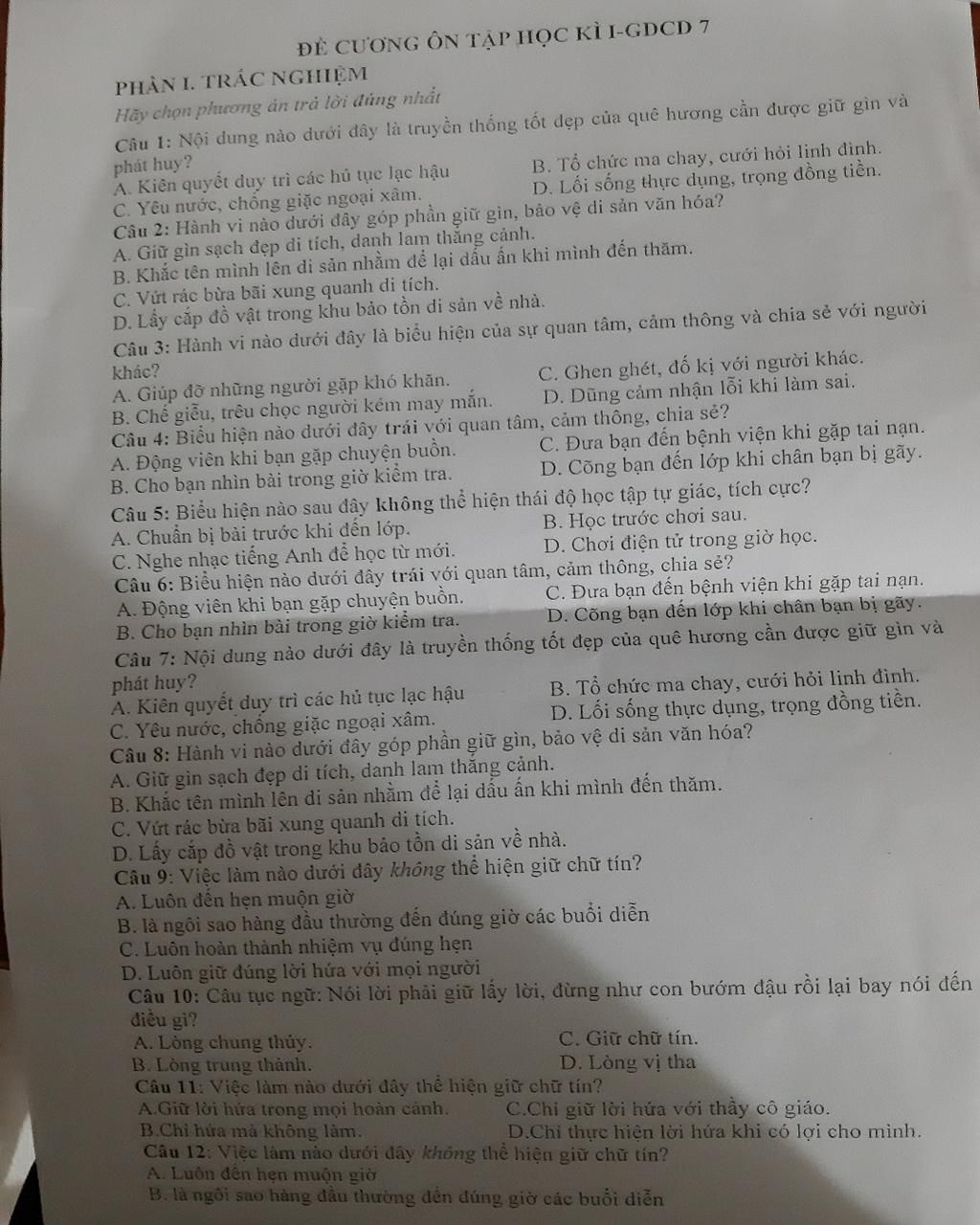 ĐỀ CƯƠNG ÔN TẬP HỌC KÌ LGDCD 7
