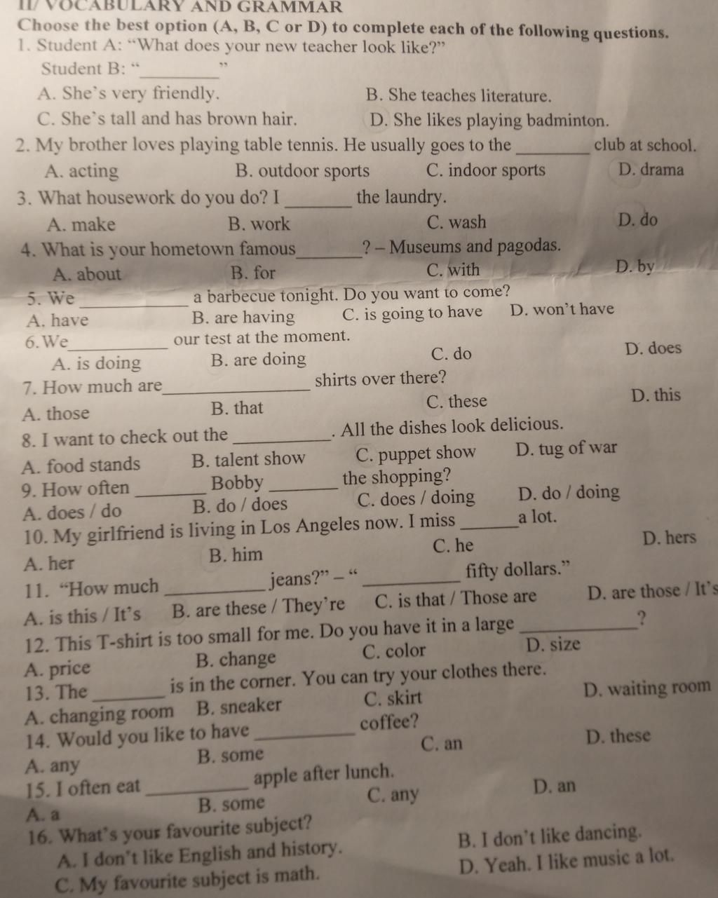 Choose the best option (A, B, C or D) to complete each of the following questions.