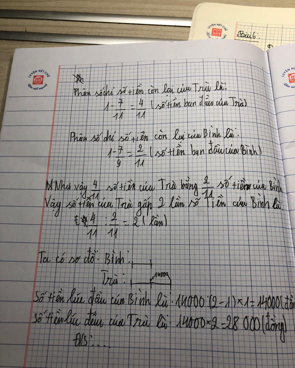 ` => 4/11` số tiền của Trà lúc đầu `= 2/9` số tiền của Bình lúc đầu