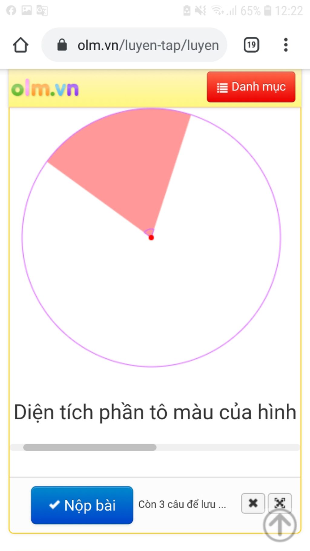 Giải thích các bước giải: diện tích của hình tròn đó là 5x5x3,14=78,5(dm²) diện tích phần tô màu là 78,5x1/5=15,7(dm²) đáp số 15,7 dm² chúc bn học tốt nhé