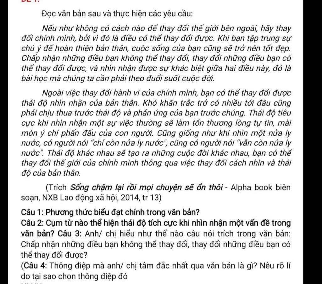 Câu 3: Câu nói "Chấp nhận những điều bạn không thể thay đổi, thay đổi những điều bạn có thể thay đổi được" chính là câu nói thể hiện quan điểm sống mà mỗi con người đều cần khắc ghi trong cuộc sống. Có những hoàn cảnh sống và những thứ đến với con người mà chúng ta không thể thay đổi được thì chúng ta học cách chấp nhận nó. Tuy nhiên, việc chúng ta phản ứng với mọi việc trong cuộc sống lại là thứ mà ta có thể thay đổi ở trong tâm của chúng ta. Đó chính là thái độ mạnh mẽ để thích ứng với hoàn cảnh tốt hơn và không ngừng ý chí, nỗ lực hơn nữa để gặt hái những thành công.