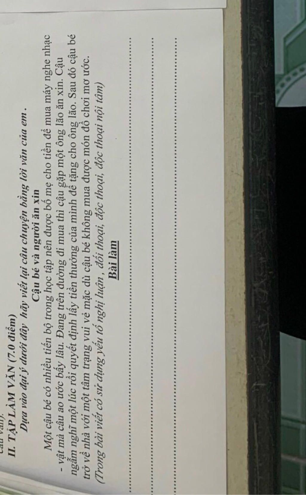Tôi bối rối. Ông ấy không nhận á? Vậy thôi mình cũng không cần cho nữa nhỉ? Tôi cứ chìm sâu trong suy nghĩ. Liệu chiếc máy nghe nhạc đó đối với mình hay một chút đồ ăn, một chiếc áo đối với ông lão ấy sẽ đáng giá hơn? Liệu mình có cần máy nghe nhạc đến thế? Mình mượn điện thoại của bố mẹ được mà? Tôi chạy sang hướng ngược lại, vào siêu thị. Tôi đi ra với một chiếc áo ấm, vài món đồ ăn và còn dư `150` nghìn. Tôi lén đút số tiền còn lại vào túi áo rồi đem đến đưa cho ông lão. Bây giờ, ông không từ chối nữa, ông nhận nó với một vẻ mặt rạng rỡ, hạnh phúc, nhiều năm rồi ông chưa được ai quan tâm nhiều đến như vậy, người quan tâm ông lại là một đứa trẻ lớp `3` nữa chứ. Tôi cười rồi nói và không chờ ông đáp lại: