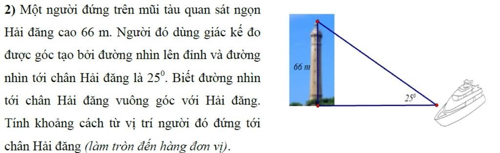 Gọi `x` ( mét ) là độ dài từ vị trí người đó đứng tới chân hải đăng