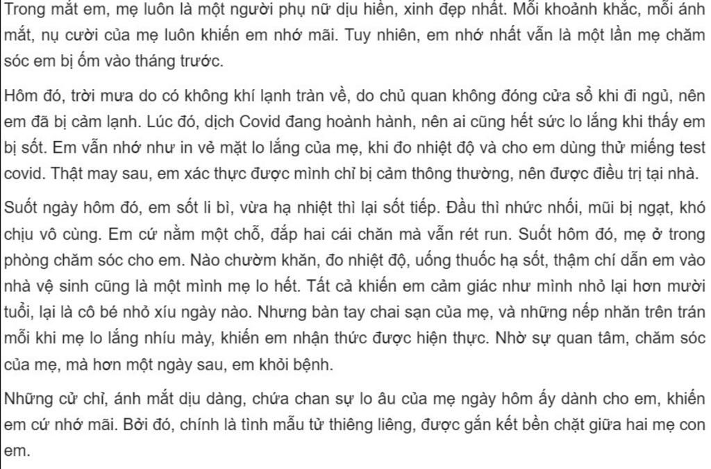 Em là một đứa trẻ rất nghịch ngợm, rất chủ quan với sức khoẻ của mình. Vì vậy nếu không nhờ có mẹ, em đã không thể luôn duy trì cơ thể khỏe mạnh như bây giờ. Nhưng tình yêu thương, chăm sóc của mẹ khi em bị ốm đã giúp em ý thức sâu sắc hơn về tình mẫu tử, về việc biết giữ gìn bản thân để không ai phải lo lắng. Đó là hôm gió mùa về, trời nổi gió to và rét lạnh. Nhưng hôm ấy mẹ lại bận đi công tác chưa về, em ở nhà lại tắm nước lạnh. Kết quả là hôm ấy em bị cảm lạnh. Mẹ đã thức suốt đêm để săn sóc cho em. Khuôn mặt mẹ đầy lo âu và xám ngắt, bởi chưa bao giờ mẹ để em bị ốm nặng như vậy. Có lẽ mẹ đã tự trách mình vì không chăm sóc em thật tốt. Nằm trên giường bệnh, em miên man vào giấc ngủ dài mệt mỏi. Thỉnh thoảng chỉ thấy thấp thoáng bóng mẹ đổ dài trên chiếc gường, thoắt trông thấy thoắt biến mất. em cảm nhận như bàn tay của mẹ lúc nào cũng nắm lấy tay em, âu yếm vuốt ve để truyền cho em hơi ấm của tình mẫu tử. Chốc chốc, mẹ lại thay khăn lau tay, lau mặt cho em luôn trông gọn gàng, không có cảm giác khó chịu. Mờ mờ không rõ vì mệt, nhưng em dường như vẫn cảm thấy nhìn rất rõ đôi mắt mẹ, long lanh ướt, và trìu mến yêu thương lẫn cả sự lo lắng nữa. Tiếng đêm tĩnh mịch càng khiến nhịp thở hổn hển của mẹ rõ hơn. Chao ôi, lúc ấy em chỉ muốn ôm mẹ vào lòng, xin lỗi mẹ vì sự nghịch ngợm của mình. Bàn tay dịu dàng của mẹ nắm lấy bàn tay non nớt của em khiến hơi ấm lan tỏa mạnh mẽ hơn. em như được tiếp thêm sức mạnh nên hôm sau cảm thấy đỡ hơn rất nhiều. Sáng dậy, mặt trời đã lên cao, ngoài vườn lảnh lót tiếng chim vang. Dường như vạn vật cũng đang cất lên một giai điệu ngọt ngào, vui tươi để chào mừng cô bé xinh xắn, đáng yêu là em. Mẹ choàng tỉnh dậy khi thấy em khẽ cử động tay, đôi mắt dài màu nâu ấy, hôm nay em mới có dịp được ngắm kĩ, nó thâm quầng và khô vì sự thiếu ngủ do phải làm việc mệt mỏi và hôm nay là vì chăm sóc em ốm nữa. em ôm mẹ vào lòng, hổn hển trong lời xin lỗi vì đã để mẹ nhọc lòng