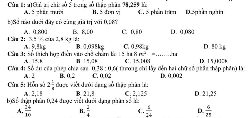 Câu 1: a)Giá trị chữ số 5 trong số thập phân 78,259 là: