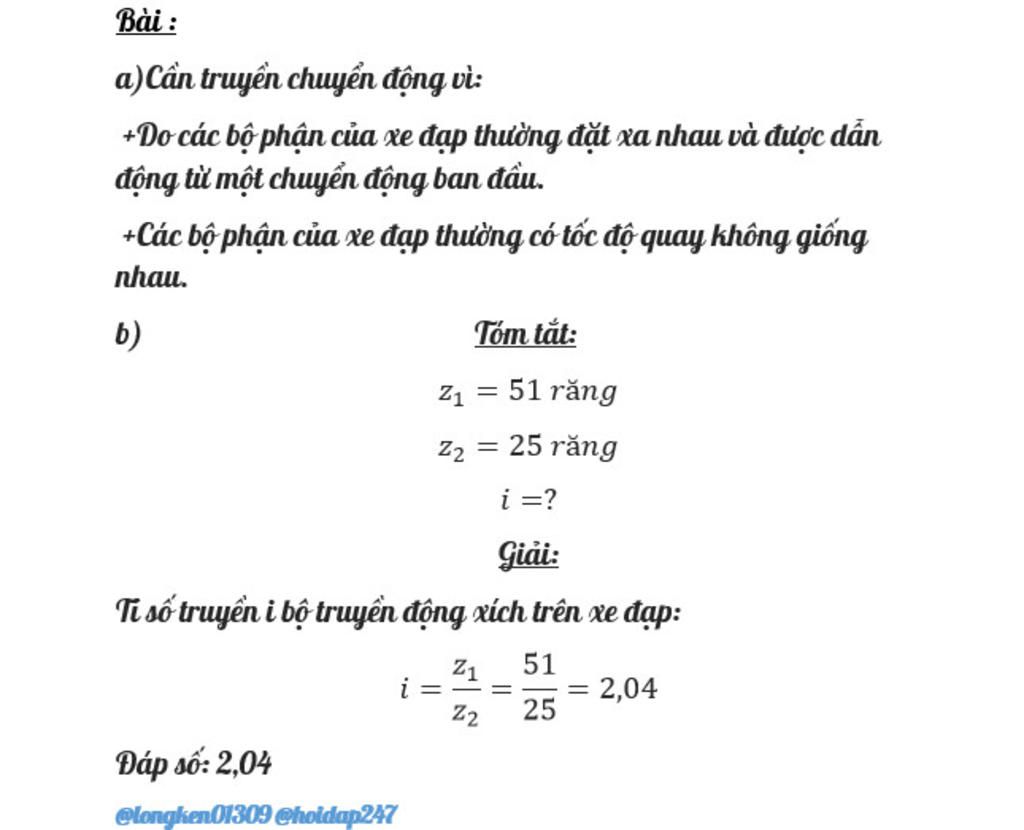 b) Tính tỉ số truyền i bộ truyền động xích trên xe đạp, biết bánh dãnh có 51 răng, bánh bị dẫn có 25 răng.
