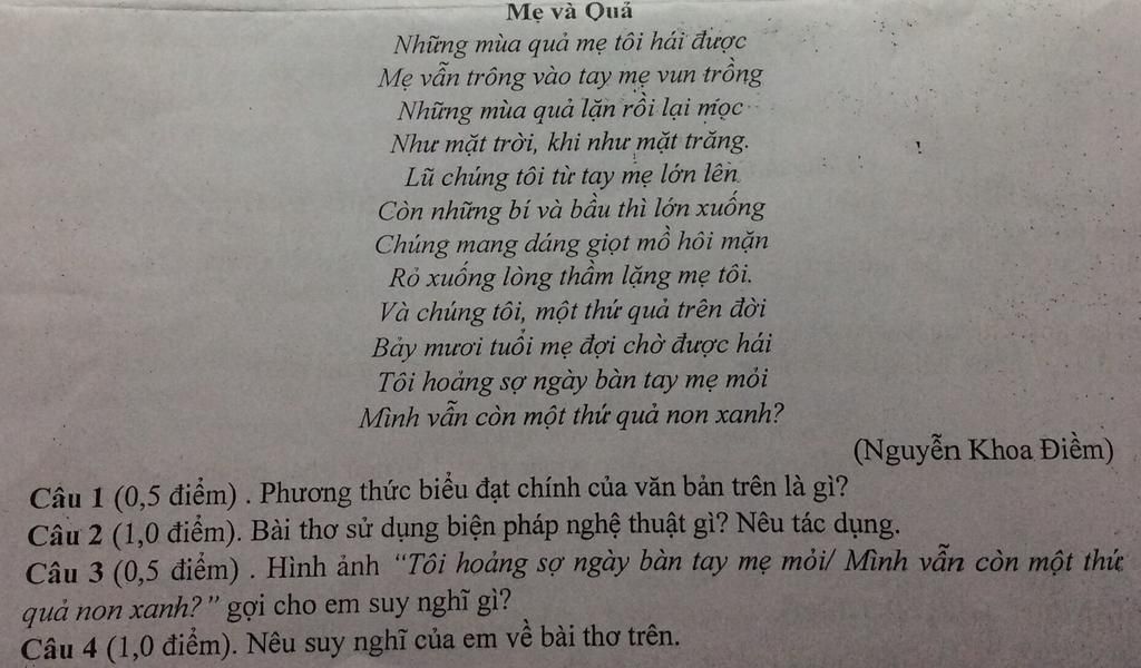 `@` Hình ảnh: " Tôi hoảng sợ ngày bàn tay mẹ mỏi / Mình vẫn còn một thứ quả non xanh" gợi cho em suy nghĩ rằng: Đứa con sợ mẹ không thể hưởng thụ được vinh hoa phú quý trước khi mình kịp thành đạt. Tới lúc đó đứa con mới chợt nhận ra và hoảng sợ điều đó sẽ tới.