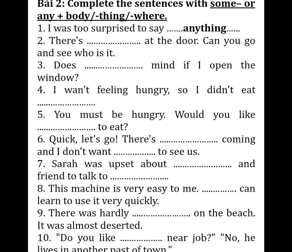 9. There was hardly ..anybody.. on the beach. It was almost deserted.