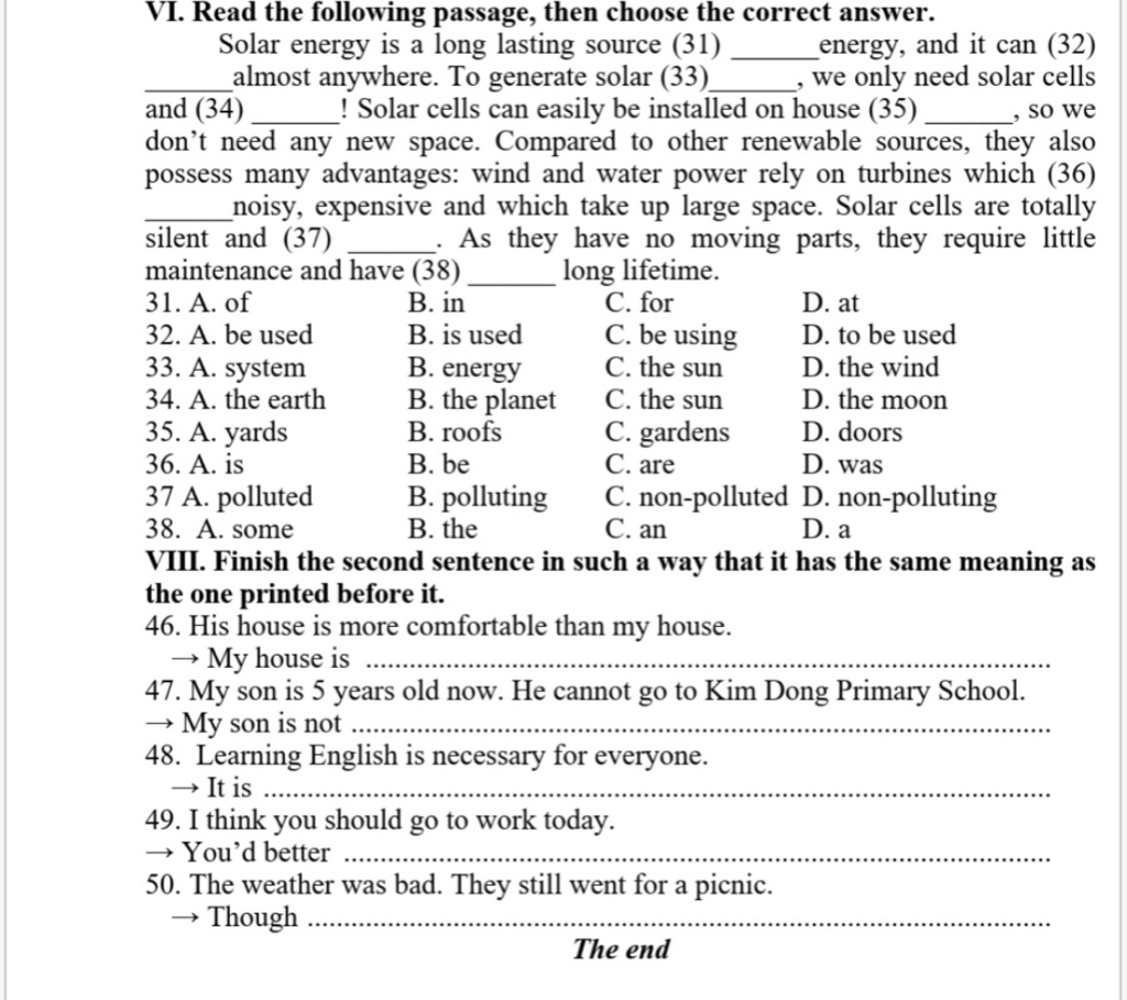 VIII. 46. My house isn't as comfortable as his house. 48. It's necessary to learn English for someone 49. You'd better go to work today. 50. Though the weather was bad, they still went for a picnic.
