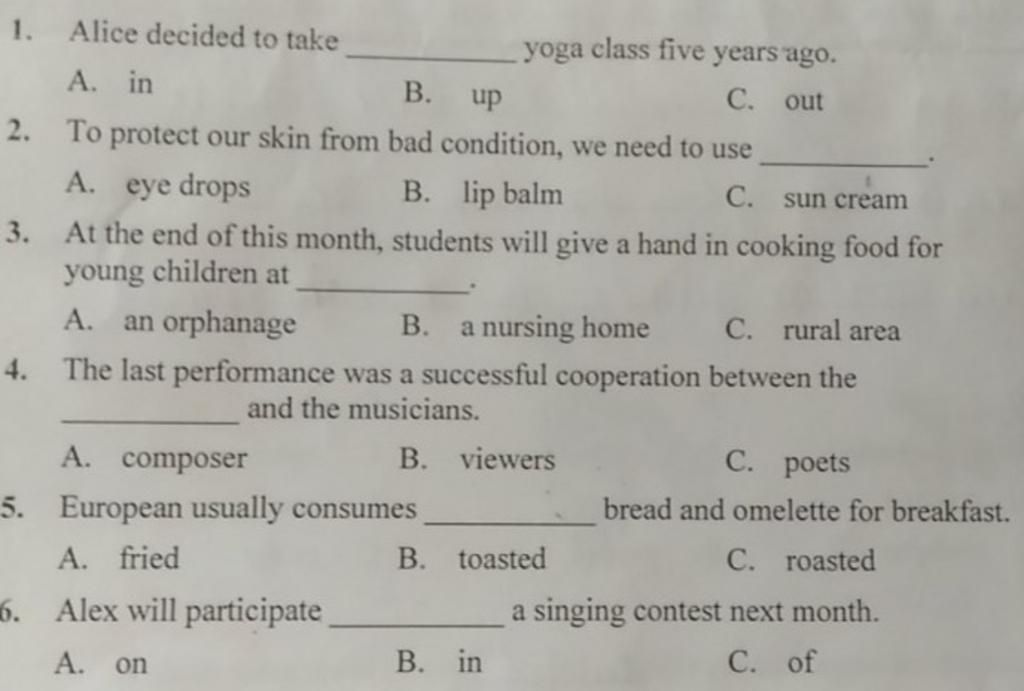 - "To protect our skin from bad condition, we need to use" : Để bảo vệ làn da của chúng ta khỏi điều kiện xấu nhất, chúng ta cần sử dụng -> sun cream : kem chống nắng