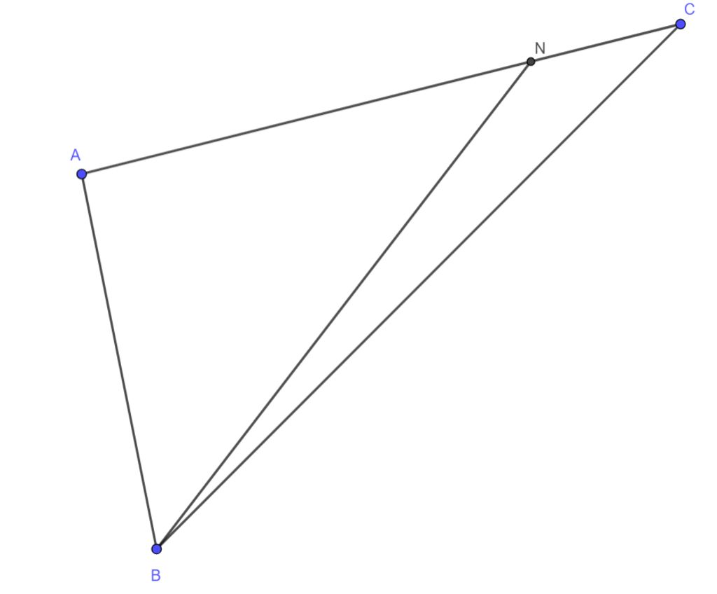 $N(x_N; y_N) \in AC, AN=3NC\\ \Rightarrow \overrightarrow{AN}=3\overrightarrow{NC}\\ \Leftrightarrow (x_N-1; y_N-1)=3(9-x_N; 3-y_N)\\ \Leftrightarrow (x_N-1; y_N-1)=(27-3x_N; 9-3y_N)\\ \Leftrightarrow \left\{\begin{array}{l} x_N-1=27-3x_N\\ y_N-1=9-3y_N\end{array} \right.\\ \Leftrightarrow \left\{\begin{array}{l} x_N=7\\ y_N=\dfrac{5}{2}\end{array} \right.\\ BN=\sqrt{\left(7-2\right)^2+\left(\dfrac{5}{2}+4\right)^2}=\dfrac{\sqrt{269}}{2}.$