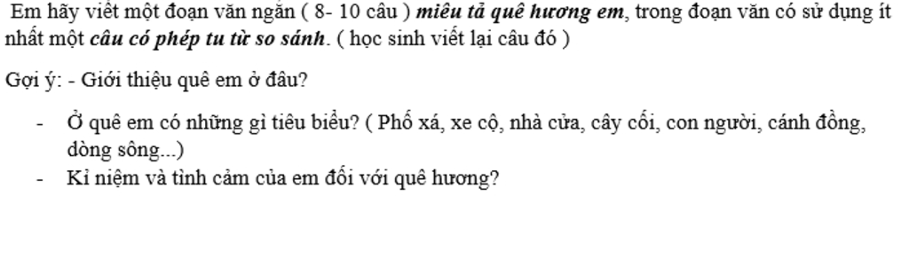 Quê hương là gì hở mẹ Mà sao cô dạy phải yêu Quê hương là gì hở mẹ Ai đi xa cũng nhớ nhiều Những câu thơ gần gũi trên đã gợi trong lòng mỗi người về thứ tình cảm giản dị là tình yêu quê hương .Quê bạn ở đâu ? Quê tôi ở quảng ngãi là một tỉnh duyên hải miền Trung,được biết đến với tên gọi “quê mía xứ đường”.Quảng Ngãi là mảnh đất có bề dày lịch sử về Văn hóa Sa Huỳnh và Văn hóa Chăm Pa, với nhiều di tích nổi tiếng như Khe Hai, Mỹ Khê, Minh Tân, Đức Tân, Sa Huỳnh, và ẩm thực đọc đáo :Don, kẹo mạch nha . Quảng Ngãi không chỉ là vùng đất giàu có vè thiên nhiên mà con người nơi đây cũng rất gần gũi , cởi mở và hiếu khách. Với tôi quảng ngãi là nơi tôi chôn nhau cắt dốn , nới tôi lưu giữ những kỉ niệm đẹp bên gia đình , bạn bè nên quê hương nơi đây như 1 trái tim nóng , như tấm lòng mẹ luôn dang rộng cánh tay để chào đón tôi trở về . Bởi tôi biết con người có nhiều chốn để đi nhưng chỉ có 1 nơi để về đó là quê hương. - câu văn ss :"Với tôi quảng ngãi là nơi tôi chôn nhau cắt dốn , nới tôi lưu giữ những kỉ niệm đẹp bên gia đình , bạn bè nên quê hương nơi đây như 1 trái tim nóng , như tấm lòng mẹ luôn dang rộng cánh tay để chào đón tôi trở về"