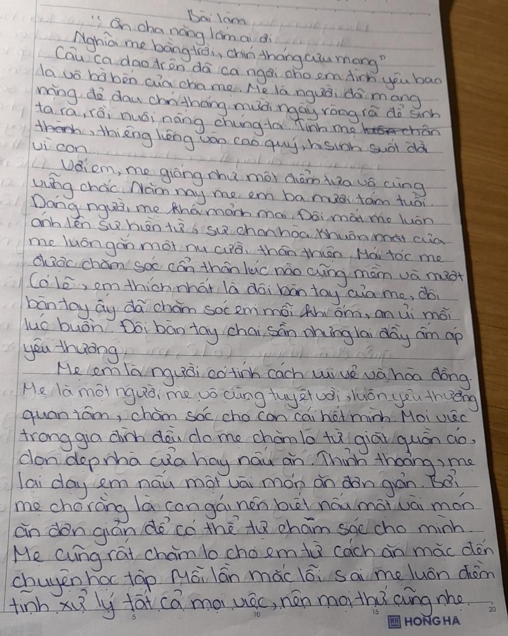 Sau đó, em liền ra bếp ăn cơm. Ở đó, bố cũng đang ngồi chờ em bằng ánh mắt hiền từ. Vậy là em vừa ăn, vừa cười nói, nụ cười rạng rỡ lại trở về trên khuôn mặt vẫn còn chưa khô nước mắt của em. Sau lần ấy, em lại càng thêm yêu quý mẹ của mình hơn. Mỗi ngày, em luôn cố gắng nỗ lực hết sức mình để làm cho mẹ vui vẻ. Vì em muốn mẹ sẽ được tự hào về em. Ngoài ra, vào những thời gian rảnh, em còn giúp mẹ làm việc nhà như quét nhà, nấu cơm, rửa bát, phơi áo quần… để mẹ có thời gian được nghỉ ngơi.