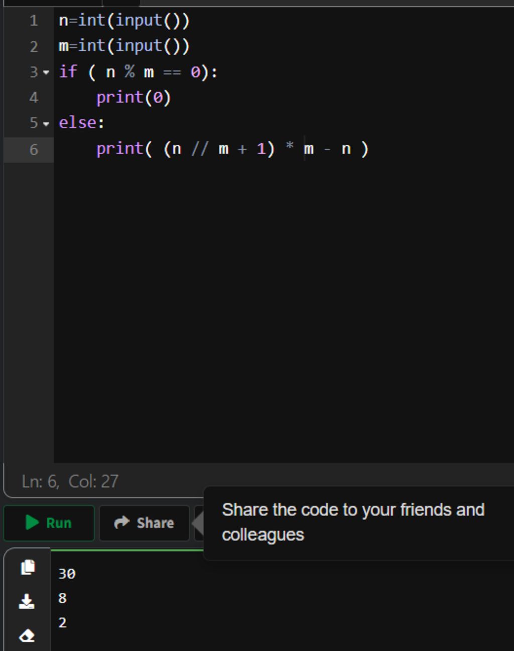 Nếu số dư của phép n chia m lấy dư là 0 thì in ra 0 tức là số táo của bà sẽ được chia đều cho các cháu.