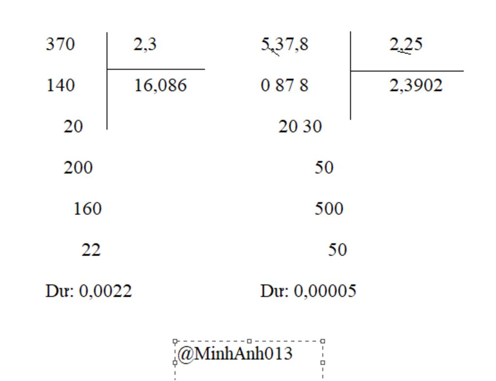 tìm số dư trong phép chia sau 5,378:2,25 lấy 4 chữ số ở phần thập phân của thương