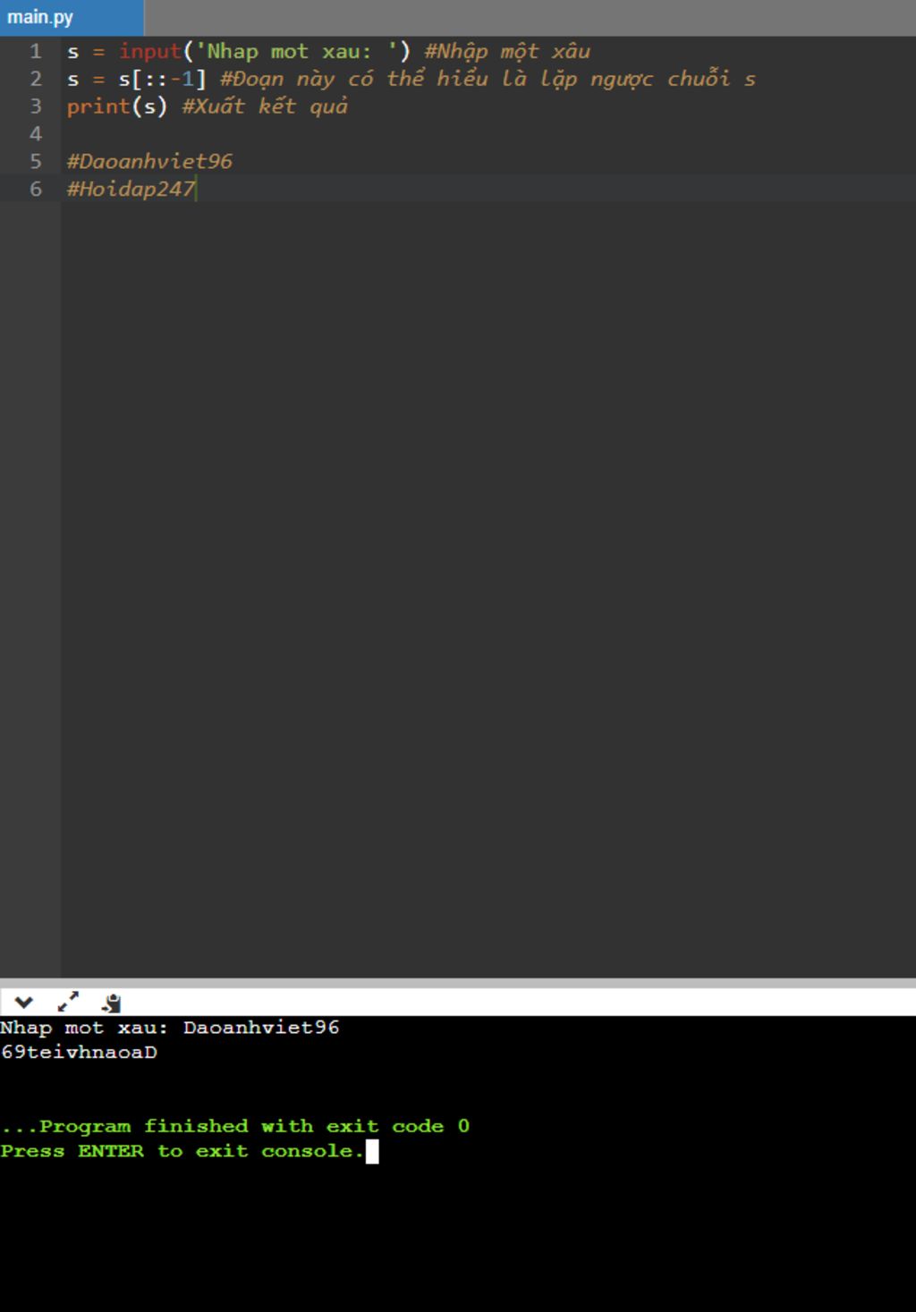 s = s[::-1] #Đoạn này có thể hiểu là lặp ngược chuỗi s
