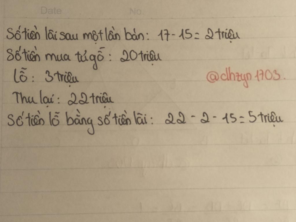 Một gia đình mua một cái tủ gỗ giá 15 triệu, rồi bán đi với giá 17 triệu, sau đó mua lại giá 20 triệu rồi lại bán đi với giá 22 triệu. Gia đình bán tủ lãi bao nhiêu?