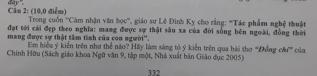 Theo giáo sư Lê Đình Kỵ cho rằng: " Tác phẩm nghệ thuật đạt tới cái đẹp theo nghĩa: mang được sự thật sâu xa của đời sống bên ngoài, đồng thời mang được sự thật tâm tình của con người." là một ý kiến vô cùng độc đáo, nhưng có thể dễ dàng hiểu, đó là một tác phẩm đạt tới cái đẹp là những tác phẩm phản ảnh được một cách chân thực, sâu sắc hiện thực khách quan cũng như khám phá, diễn tả được một cách chân thực, sâu sắc thế giới tâm hồn, tình cảm của con người. Và đồng thời, ta thấy được cái chân lí ấy thông qua bài thơ " Đồng Chí" của Chính Hữu, cũng là một tác phẩm đã đạt được cái đẹp của nghệ thuật.