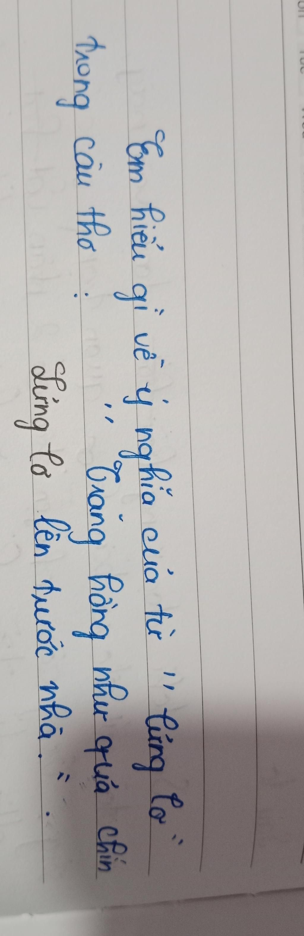 $→$ Từ lơ lửng trong bài thơ ''Trăng ơi...từ đâu đến'' mang nét nghĩa ở trạng thái nhẹ nhàng đứng im giữa không trung, ở một khoảng cách không quá cao, cũng không quá thấp, thoại nhìn ra có thể tưởng chừng như trăng đang ở ngay trước nhà. Từ ''lửng lơ'' chỉ trăng ở trạng thái lưng chừng giữa không trung, không bám víu vào đâu, chỉ đơn giản là lưng chừng, nhẹ nhàng bất động giữa khoảng không trung bao la, tưởng tượng ra như có thể trăng chỉ đang cách ta một khoảng cách gần, như trăng đang đậu lại trước nhà. (theo cách hiểu của cá nhân mình)