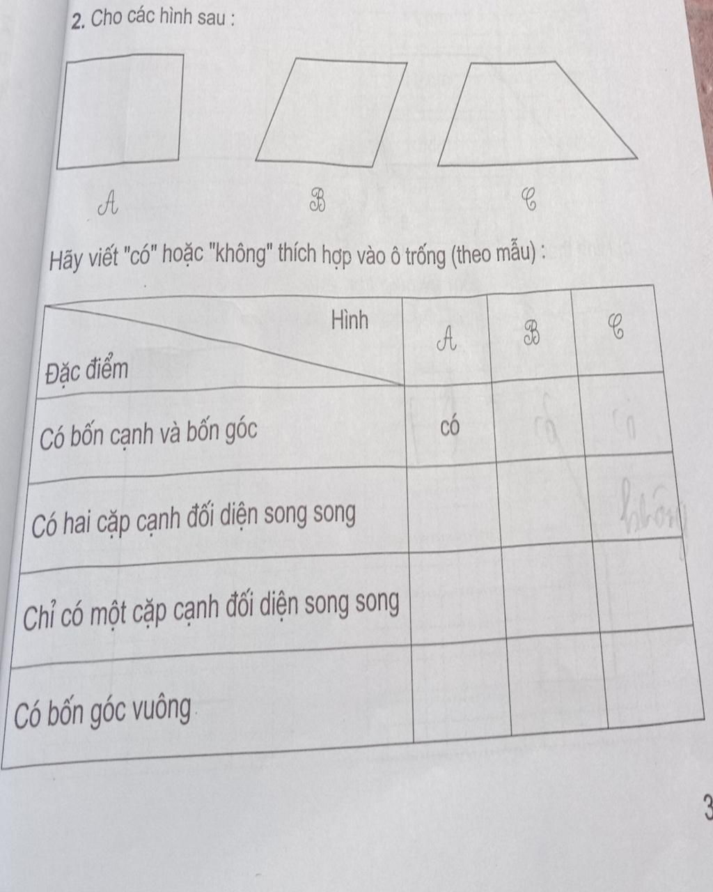 Hình A, hình B, hình C đều có bốn cạnh và bốn góc