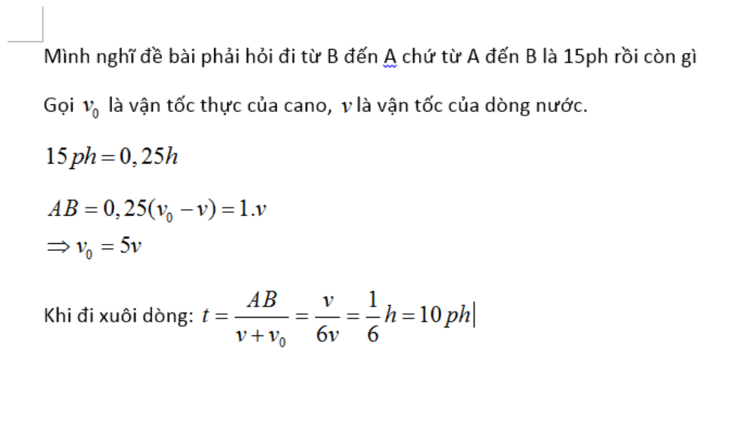 {v_1} - {v_2} = \dfrac{{AB}}{{{t_1}}} = \dfrac{{AB}}{{0,25}} = 4AB\left( {km/h} \right)\\