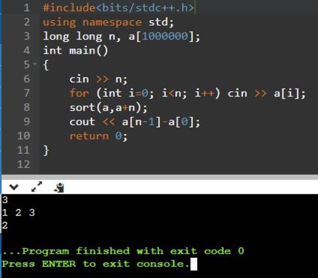 #include<bits/stdc++.h>; using namespace std; long long n, a[1000000]; int main() { cin >> n; for (int i = 0; i < n; i ++) cin >> a[ i ]; sort (a, a + n); cout << a[n - 1] - a[ 0 ]; return 0; }