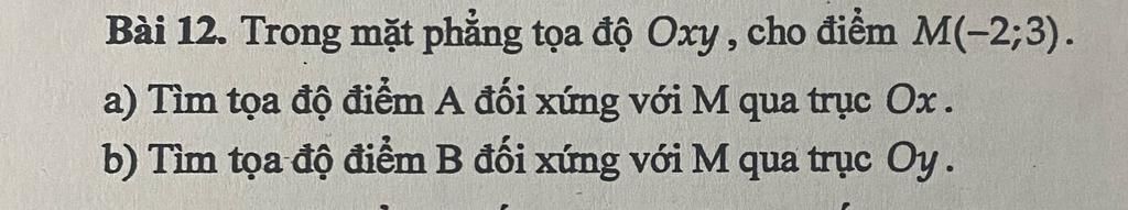 Điểm đối xứng với `M(-2;3)` qua `Ox` là `A(-2;-3)`