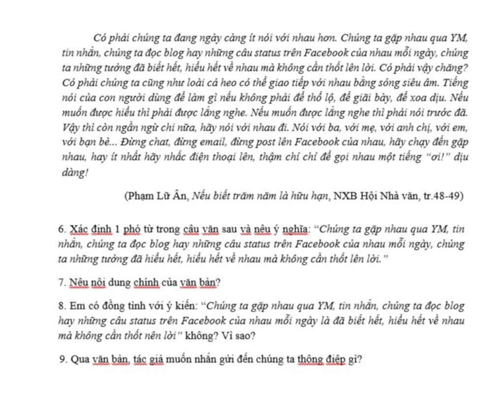 Nói lên thực trạng sử dụng mạng xã hội thay nổi nói . Từ đó , nhà văn đã đưa ra những dẫn chứng phù hợp , sắc bén về lời nói . Qua đó , nhà văn cũng nêu nên một thông điệp " con người giao tiếp nhau bằng lời nói chứ không phải qua mạng xã hội hay là những dòng tin nhắn ".