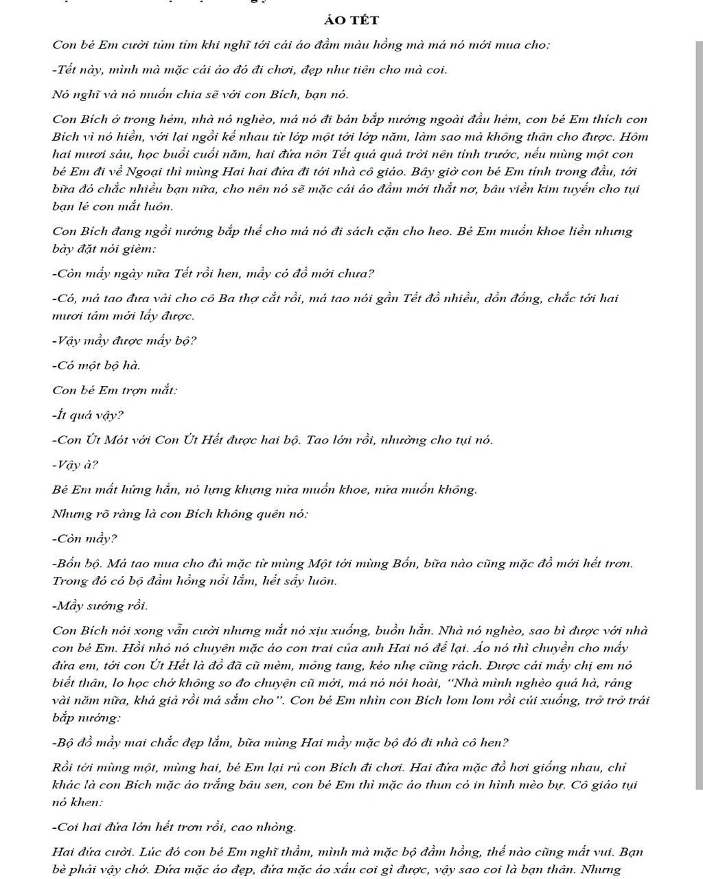 Nội dung : Nói về ngày tết của Bích và con bé em. Ca ngợi tình bạn thấu hiểu, trong sáng. Bích biết bạn thương mình, nghĩ dù bạn có mặc gì thì Bích vẫn mến bạn. Nói lên hành động và thái độ của 2 nhân vật cũng có thể thấy được sự tôn trọng dành cho nhau, không so đo thiệt hơn và đó mới là tình bạn chân chính.