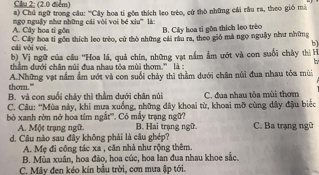 `a.` Chủ ngữ là: Cây hoa ti gôn.