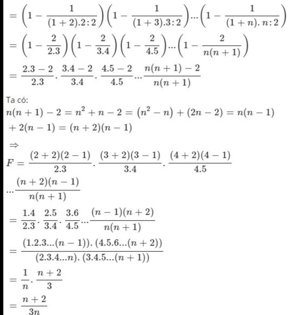 `=>` `F=((2+2)(2-1))/(2.3).((3+2)(3-1))/(3.4).((4+2)(4-1))/(4.5) ... ((n+2)(n-1))/(n(n+1))`