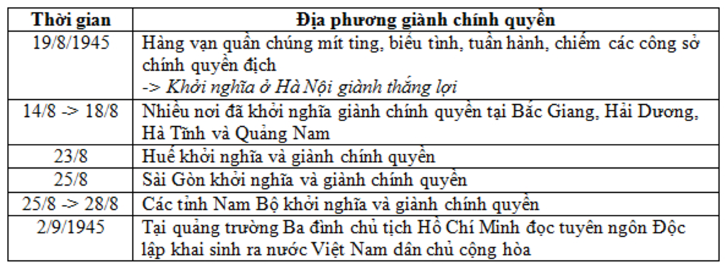Bảng thống kê các sự kiện tiêu biểu về diễn biến Tổng khởi nghĩa tháng 8 năm 1945