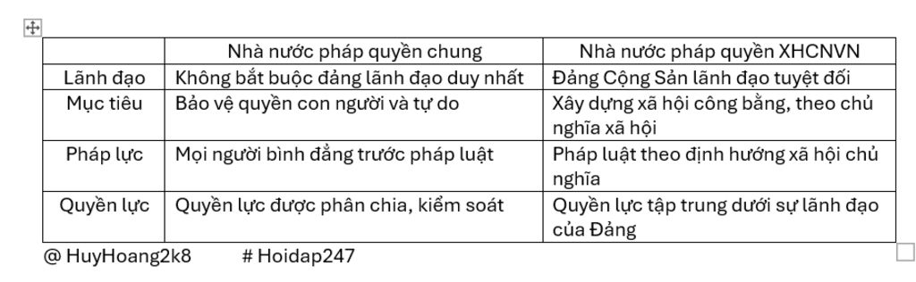 + Nhà nước pháp quyền xã hội chủ nghĩa Việt Nam dựa trên cơ sở kinh tế là chế độ công hữu về tư liệu sản xuất và mang bản chất giai cấp công nhân, nhà nước là công cụ duy trì quyền lực của đa số nhân dân lao động, thực hiện dân chủ đối với nhân dân và chuyên chính đối với kẻ thù xã hội chủ nghĩa. Trong khi đó, nhà nước pháp quyền tư sản dựa trên cơ sở kinh tế là chế độ tư hữu về tư liệu sản xuất và mang bản chất giai cấp tư sản, nhà nước là công cụ bạo lực của giai cấp thống trị, đó là thiểu số người giàu có trong xã hội – giai cấp tư sản